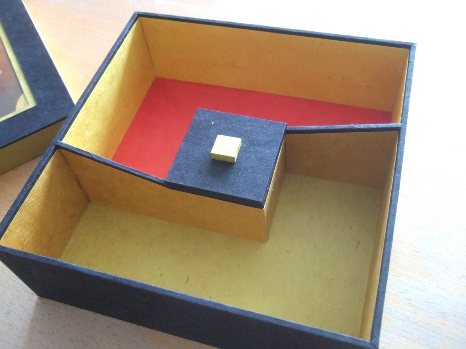 Pour cela, je pose la cartonnette d'encadrement encollée dans le casier, je mets le carton par dessus en vérifiant qu'il est correctement positionné par rapport aux cloisons puis je retourne la boîte pour récupérer le tout et je mets sous presse 24 heures pour que ça ne cintre pas.
